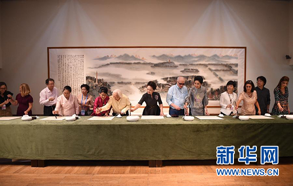 9月5日,國(guó)家主席習(xí)近平夫人彭麗媛邀請(qǐng)出席二十國(guó)集團(tuán)領(lǐng)導(dǎo)人杭州峰會(huì)外方代表團(tuán)團(tuán)長(zhǎng)夫人參觀中國(guó)美術(shù)學(xué)院。這是彭麗媛與來賓一同書寫漢字“和”。新華社記者 謝環(huán)馳 攝