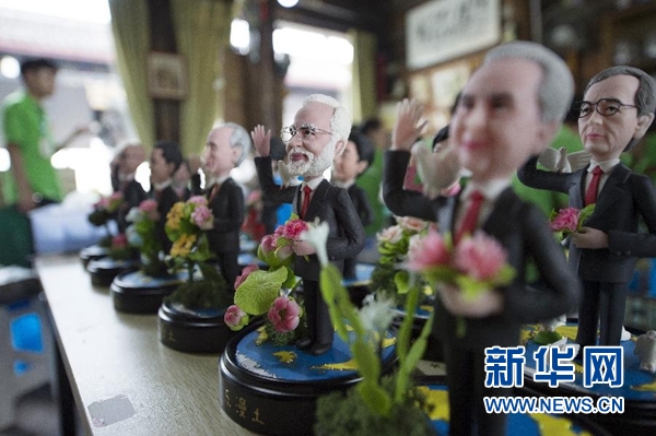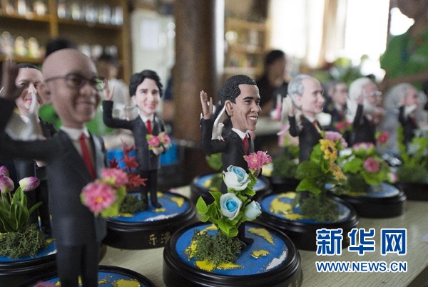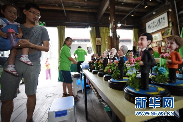 9月1日,手工藝人吳小莉創(chuàng)作的捏塑作品G20杭州峰會參會領導人形象在杭州京杭大運河畔的橋西歷史街區(qū)擺放展示。新華社記者 鞠煥宗 攝