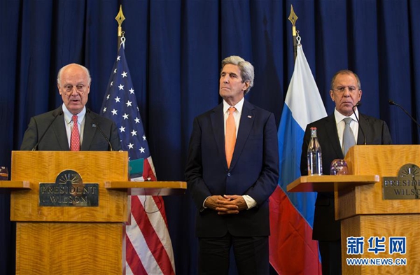 9月10日,在瑞士日內(nèi)瓦,美國(guó)國(guó)務(wù)卿克里(中)、俄羅斯外長(zhǎng)拉夫羅夫(右)和聯(lián)合國(guó)秘書長(zhǎng)敘利亞問題特使德米斯圖拉出席聯(lián)合記者會(huì)。美國(guó)國(guó)務(wù)卿克里和俄羅斯外長(zhǎng)拉夫羅夫10日凌晨在日內(nèi)瓦就敘利亞?;饏f(xié)議達(dá)成一致,新的?;饏f(xié)議將于下周生效。 新華社記者 徐金泉 攝