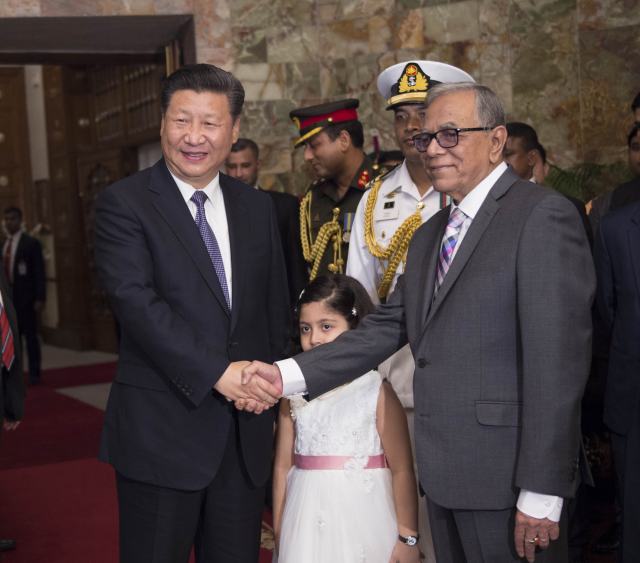 【中孟兩國(guó)友誼代代相傳再寫(xiě)佳話】14日中午,習(xí)近平主席抵達(dá)孟加拉國(guó)首都達(dá)卡,在機(jī)場(chǎng)受到熱烈歡迎。哈米德總統(tǒng)親自到機(jī)場(chǎng)迎接,并帶來(lái)自己的小孫女向習(xí)主席獻(xiàn)上鮮花。無(wú)獨(dú)有偶,1956年,周恩來(lái)總理訪問(wèn)孟加拉國(guó)時(shí),孟加拉國(guó)國(guó)父拉赫曼帶著女兒向周總理獻(xiàn)花。當(dāng)年那位獻(xiàn)花的小姑娘正是現(xiàn)在的孟加拉國(guó)總理哈西娜。習(xí)主席深情地對(duì)孟加拉國(guó)領(lǐng)導(dǎo)人說(shuō):“這是中孟兩國(guó)友誼代代相傳的佳話。”