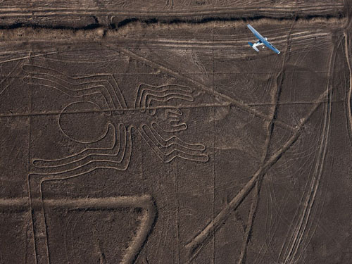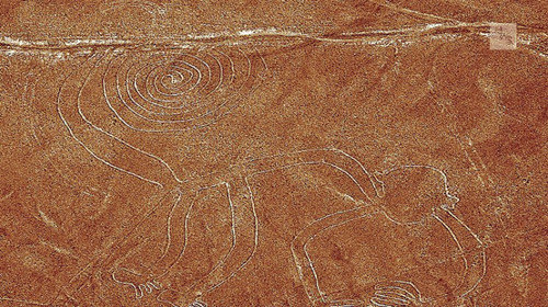 ????站在地面上的話,你幾乎看不到納斯卡線,它們由淺色泥土畫成,兩邊由深色石頭畫的線來提亮。這個(gè)地區(qū)有數(shù)量眾多的納斯卡線——長達(dá)幾千米的碎片狀的三角形和矩形,非寫實(shí)的動(dòng)物和鳥類圖案:一只猴子,一只禿鷹,一只完全對稱的蜘蛛,一只蜂鳥。