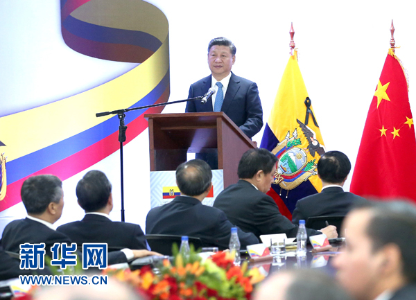 當(dāng)?shù)貢r(shí)間11月18日,國(guó)家主席習(xí)近平在基多同厄瓜多爾總統(tǒng)科雷亞共同出席中方援建的厄瓜多爾公共安全應(yīng)急指揮中心聯(lián)合實(shí)驗(yàn)室揭牌儀式,喬內(nèi)醫(yī)院奠基、科卡科多-辛克雷水電站竣工發(fā)電視頻連線活動(dòng)。這是習(xí)近平出席活動(dòng)后致辭。新華社記者 馬占成 攝