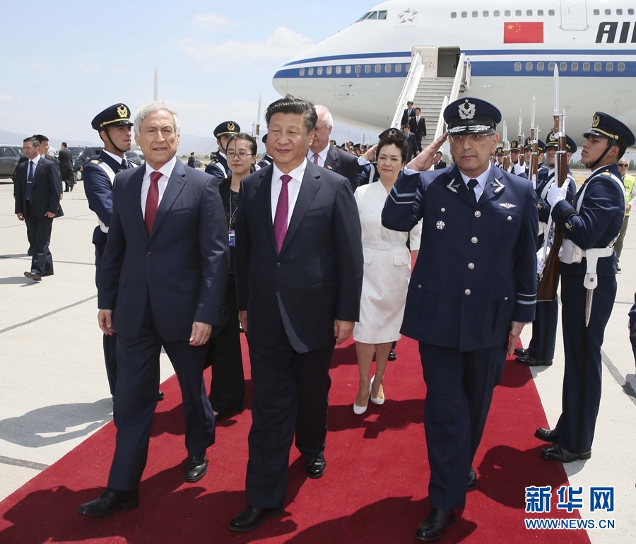 11月22日,國(guó)家主席習(xí)近平抵達(dá)圣地亞哥,對(duì)智利共和國(guó)進(jìn)行國(guó)事訪問(wèn)。智利外長(zhǎng)穆尼奧斯等在機(jī)場(chǎng)迎接習(xí)近平和夫人彭麗媛。 新華社記者蘭紅光 攝