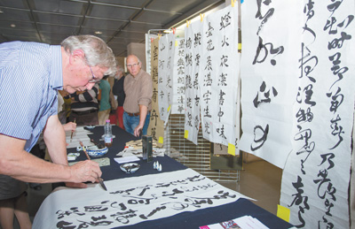 日內(nèi)瓦大學(xué)孔子學(xué)院舉辦的中國書法展示活動上,一位當?shù)貪h語愛好者展示書法技藝。