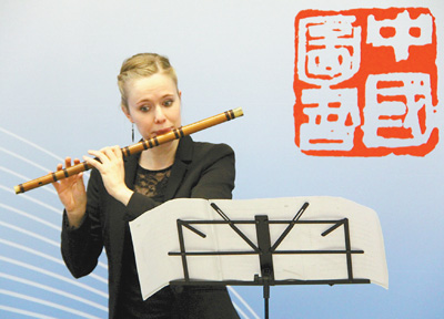 1月11日,在瑞士蘇黎世大學(xué),一名當?shù)貙W(xué)生在“中國圖書中心”揭幕儀式上表演笛子獨奏。