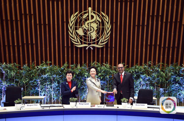 1月18日,國(guó)家主席習(xí)近平夫人、世界衛(wèi)生組織結(jié)核病和艾滋病防治親善大使彭麗媛應(yīng)世界衛(wèi)生組織總干事陳馮富珍和聯(lián)合國(guó)艾滋病規(guī)劃署執(zhí)行主任西迪貝邀請(qǐng),在瑞士日內(nèi)瓦出席為她舉行的親善大使任期續(xù)延暨頒獎(jiǎng)儀式。這是世界衛(wèi)生組織總干事陳馮富珍向彭麗媛頒發(fā)世衛(wèi)組織榮譽(yù)勛章。(新華社記者謝環(huán)馳攝)