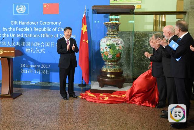 ——向萬國宮贈送景泰藍瓶。萬國宮一層大廳內(nèi),習主席和古特雷斯共同為名為“盛世歡歌”的景泰藍瓶揭幕。
