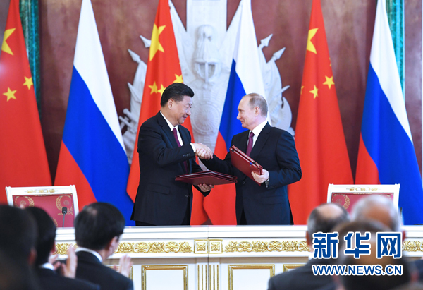 7月4日,國家主席習(xí)近平在莫斯科克里姆林宮同俄羅斯總統(tǒng)普京舉行會談。會談后,兩國元首簽署了《中華人民共和國和俄羅斯聯(lián)邦關(guān)于進(jìn)一步深化全面戰(zhàn)略協(xié)作伙伴關(guān)系的聯(lián)合聲明》《中華人民共和國和俄羅斯聯(lián)邦關(guān)于當(dāng)前世界形勢和重大國際問題的聯(lián)合聲明》,批準(zhǔn)了《〈中華人民共和國和俄羅斯聯(lián)邦睦鄰友好合作條約〉實(shí)施綱要(2017年至2020年)》并見證了《中華人民共和國外交部和俄羅斯聯(lián)邦外交部關(guān)于朝鮮半島問題的聯(lián)合聲明》以及經(jīng)貿(mào)、農(nóng)業(yè)、能源、基礎(chǔ)設(shè)施建設(shè)、金融、文化、創(chuàng)新、媒體、信息網(wǎng)絡(luò)、檢驗(yàn)檢疫等領(lǐng)域多項(xiàng)雙邊合作文件的交換。新華社記者 饒愛民 攝