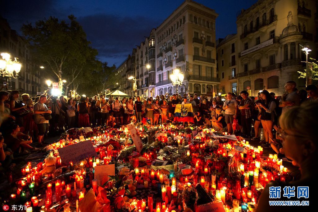當(dāng)?shù)貢r(shí)間2017年8月18日,西班牙巴塞羅那,當(dāng)?shù)孛癖婞c(diǎn)燭獻(xiàn)花悼念恐襲事件遇難者。17日,一輛白色貨車在巴塞羅那市中心蘭布拉大道加泰羅尼亞廣場附近沖撞人群,據(jù)媒體報(bào)道,死亡人數(shù)已經(jīng)升至14人。(圖片來源:東方IC)