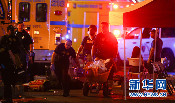 10月1日,在美國西部城市拉斯維加斯,工作人員在槍擊事件現(xiàn)場救治傷者。新華社/美聯(lián)