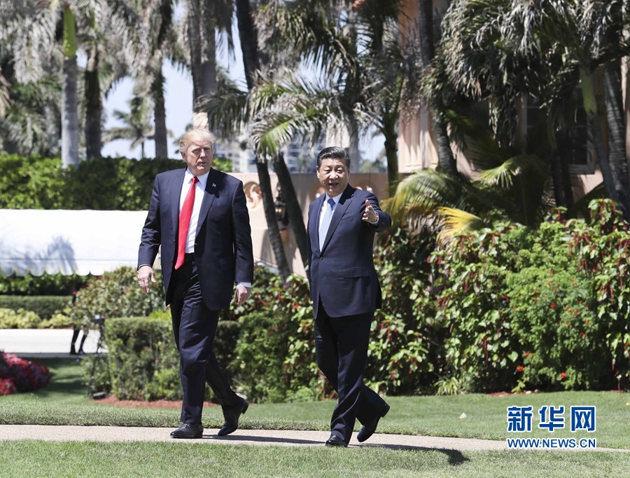 2017年4月7日,國(guó)家主席習(xí)近平在美國(guó)佛羅里達(dá)州海湖莊園同美國(guó)總統(tǒng)特朗普舉行中美元首第二場(chǎng)正式會(huì)晤。會(huì)晤后,習(xí)近平同特朗普到秀麗宜人的海湖莊園中散步,在輕松友好的氣氛中繼續(xù)就兩國(guó)友好合作進(jìn)行討論。 新華社記者 蘭紅光 攝