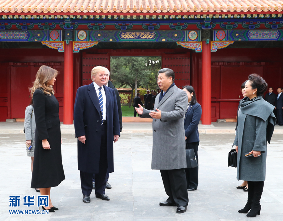 11月8日下午,國家主席習(xí)近平和夫人彭麗媛在北京故宮博物院迎接來華進行國事訪問的美國總統(tǒng)特朗普和夫人梅拉尼婭。兩國元首夫婦在寶蘊樓簡短茶敘。新華社記者謝環(huán)馳攝