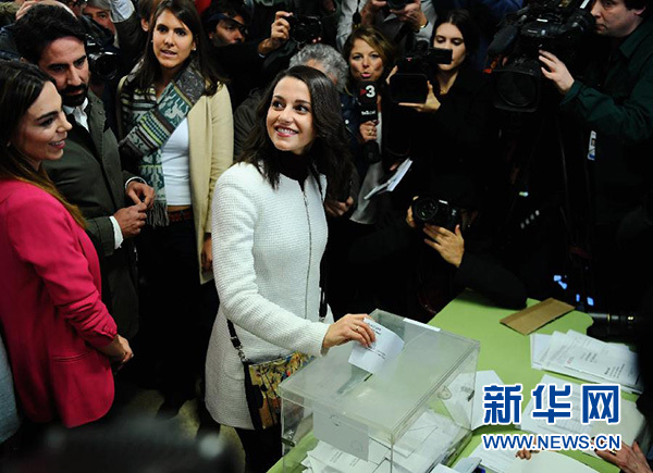 12月21日,在西班牙巴塞羅那,公民黨候選人伊內(nèi)斯·阿里馬達(dá)斯(中)在一處投票站投票。新華社記者郭求達(dá)攝