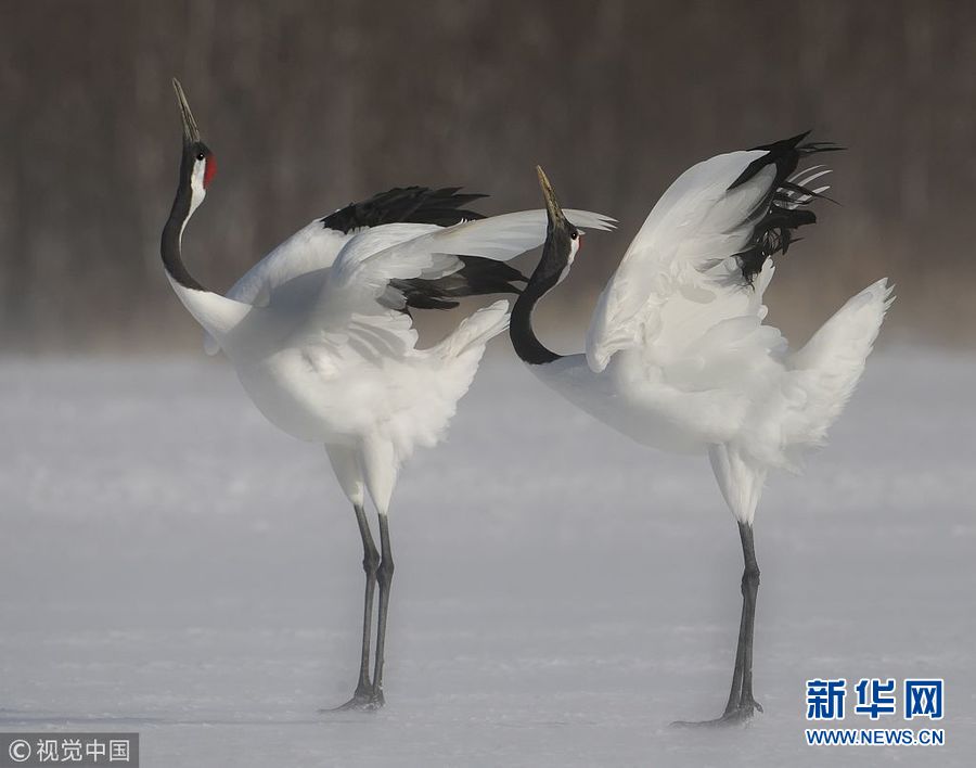 12月25日訊(具體拍攝時(shí)間不詳),日本北海道,一對(duì)丹頂鶴在冰面上翩翩起舞,動(dòng)作驚人一致。(圖片來源:視覺中國)
