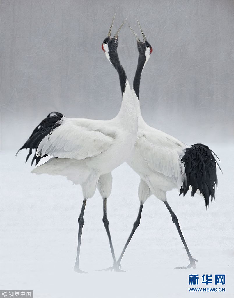 12月25日訊(具體拍攝時(shí)間不詳),日本北海道,一對(duì)丹頂鶴在冰面上翩翩起舞,動(dòng)作驚人一致。(圖片來源:視覺中國(guó))