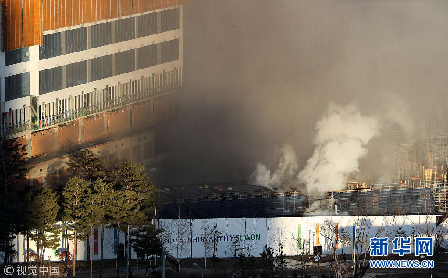 12月25日,韓國水原市,當(dāng)?shù)匾惶幑⑹┕がF(xiàn)場發(fā)生火災(zāi),現(xiàn)場濃煙滾滾。(圖片來源:視覺中國)