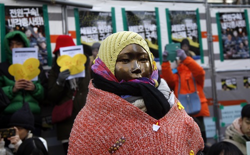 資料圖:在韓國(guó)首都首爾,民眾為“慰安婦”少女像戴上了帽子和圍巾。新華社記者姚琪琳 攝