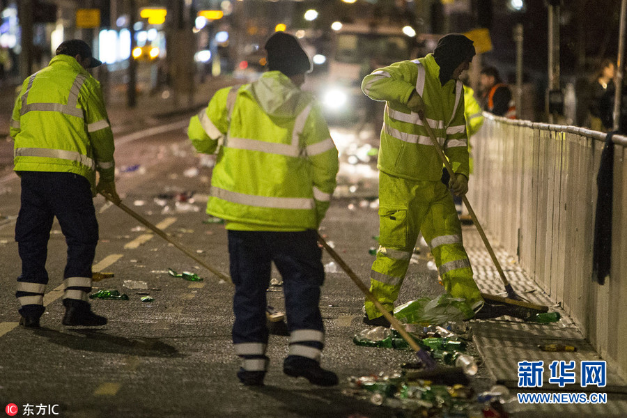 英國(guó):狂歡過后遍地垃圾 清潔工作者清理跨年夜殘局