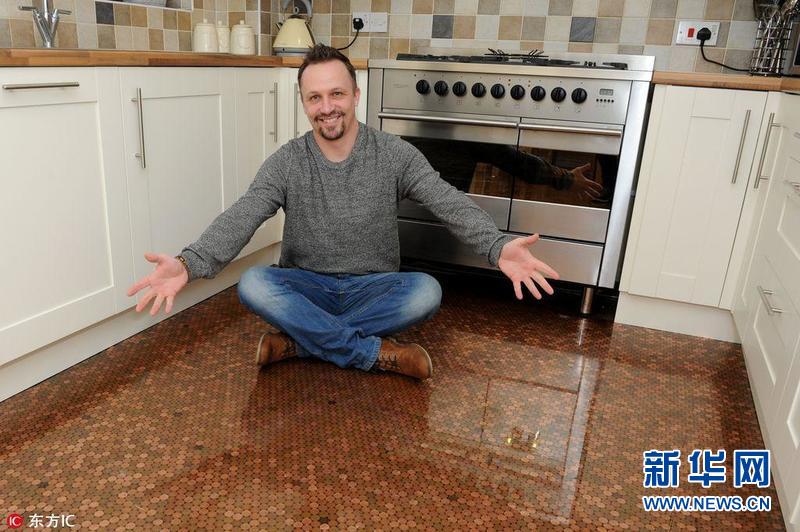 【酷!銅幣廚房】2017年2月4日,來自英國特爾福德的Matt Giles用一便士硬幣當瓷磚,共用2.7萬枚銅幣打造出了自己夢寐以求的廚房地面。