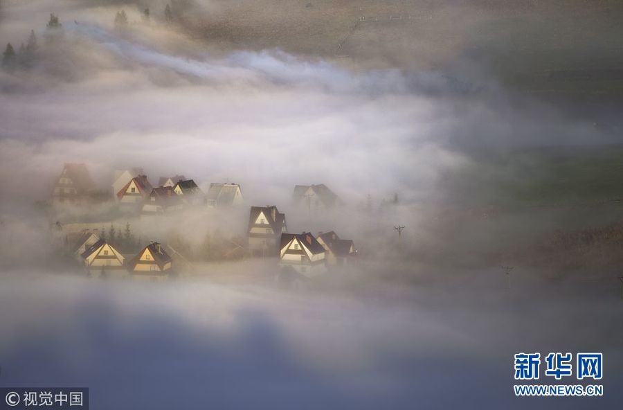 1月10日訊(具體拍攝時間不詳),波蘭皮耶尼內(nèi)山脈的一個村莊被濃霧籠罩,攝影師站在對面山上拍攝的景觀如童話世界一般,色彩繽紛的房子在濃霧中若隱若現(xiàn)仿若仙境。(圖片來源:視覺中國)