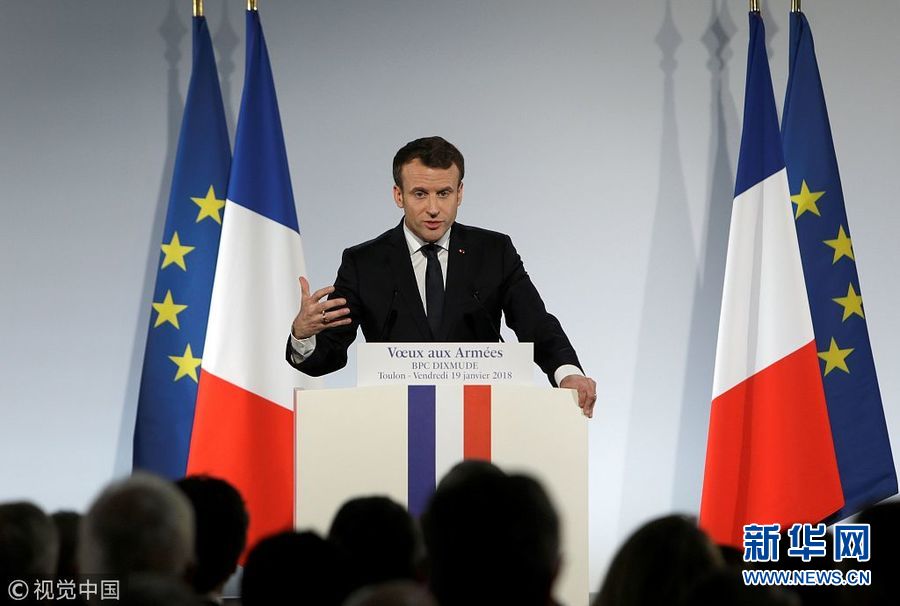 1月19日,法國土倫,法國總統(tǒng)馬克龍視察了當(dāng)?shù)氐暮\娀夭⑾蚴勘鴤儼l(fā)表新年祝福。(圖片來源:視覺中國)