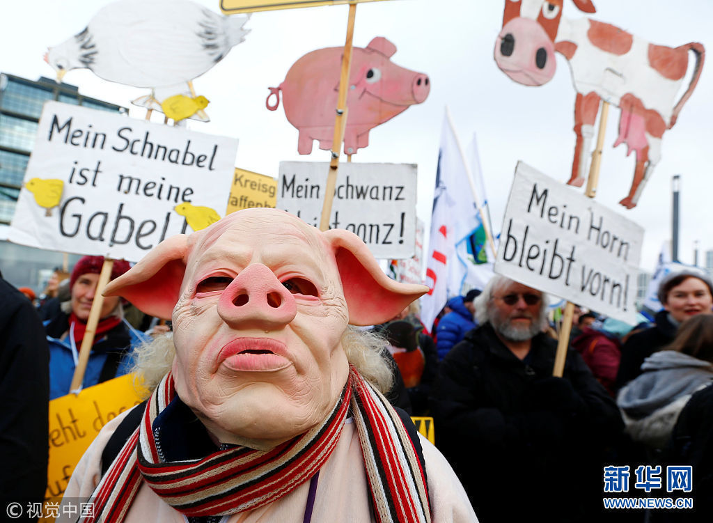 當(dāng)?shù)貢r(shí)間1月20日,德國柏林,農(nóng)民們裝扮成家畜游行,抗議柏林國際綠色周舉行,要求更多生態(tài)農(nóng)業(yè)項(xiàng)目。 (圖片來源:視覺中國)