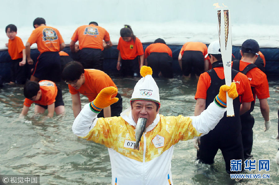 韓國奧運圣火傳遞在鱒魚慶典場地舉行 火炬手嘴含活魚拍照