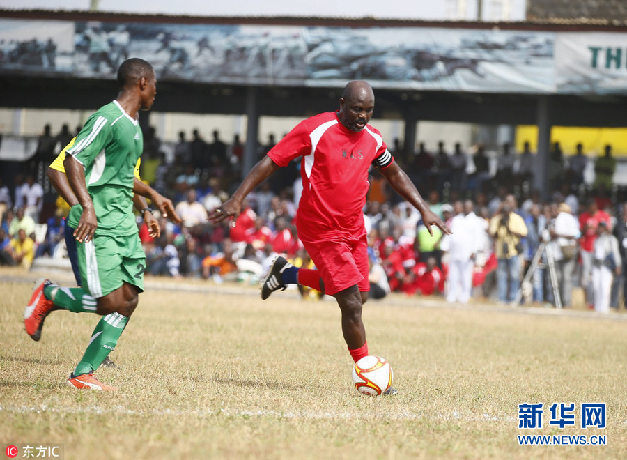 1月20日,利比里亞首都蒙羅維亞,利比里亞當(dāng)選總統(tǒng)、前世界足球先生喬治-維阿參加慈善足球比賽,率領(lǐng)維阿全明星隊(duì)對(duì)戰(zhàn)利比里亞武裝部隊(duì)士兵隊(duì)。喬治-維阿在去年12月27日當(dāng)選利比里亞新一任總統(tǒng),并將于2018年1月22日就職。(圖片來(lái)源:東方IC)
