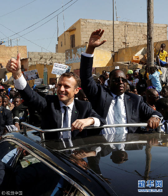 當(dāng)?shù)貢r(shí)間2月3日,塞內(nèi)加爾圣路易,塞內(nèi)加爾總統(tǒng)馬基·薩勒陪到訪的法國(guó)總統(tǒng)馬克龍?jiān)煸L當(dāng)?shù)?,兩人乘?chē)向民眾致意。(圖片來(lái)源:視覺(jué)中國(guó))