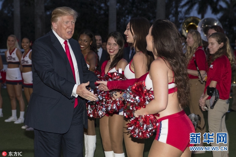 當地時間2018年2月4日,美國佛州西棕櫚灘,美國總統(tǒng)特朗普與第一夫人梅拉尼婭在高爾夫俱樂部觀看大學生樂隊的歡迎演出,與美女啦啦隊員握手。據悉,特朗普夫婦出席在該俱樂部舉辦的超級碗派對。(圖片來源:東方IC)