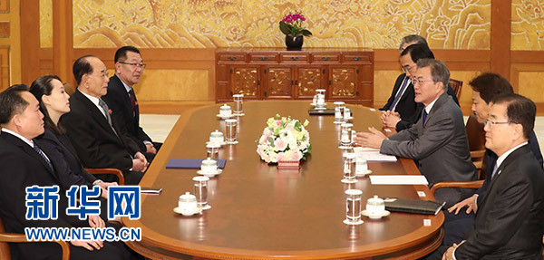 2月10日,在韓國首爾青瓦臺,韓國總統(tǒng)文在寅(右三)會見由朝鮮最高人民會議常任委員會委員長金永南(左三)率領(lǐng)的朝鮮高級別代表團(tuán)。新華社/紐西斯通訊社