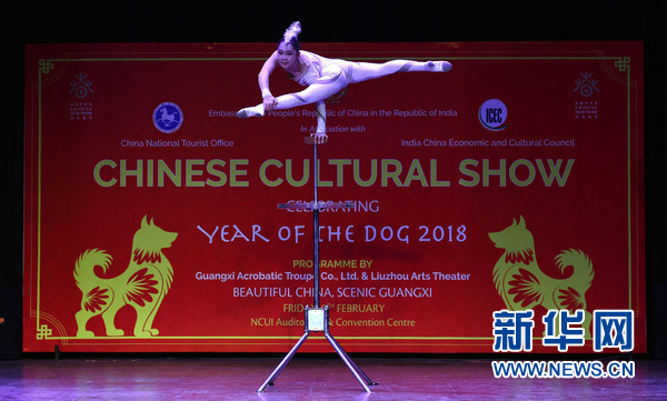 2月9日,在印度首都新德里,2018“歡樂(lè)春節(jié)”活動(dòng)演出現(xiàn)場(chǎng),中國(guó)演員在表演雜技。新華網(wǎng)發(fā)(張迺杰攝)