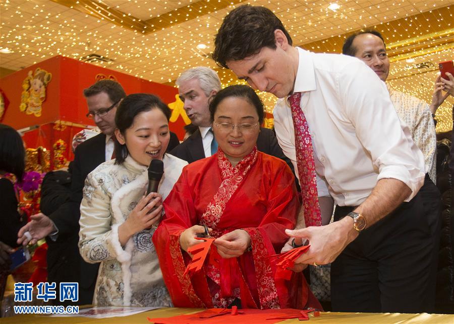2月15日,在加拿大安大略省米西索加市,總理特魯多(右)向來(lái)自中國(guó)四川的剪紙藝人學(xué)習(xí)剪紙。加拿大總理特魯多15日來(lái)到安大略省米西索加市逛年貨大街,向當(dāng)?shù)厝A人華僑拜年,共慶中國(guó)狗年春節(jié)。新華社發(fā)(鄒崢攝)