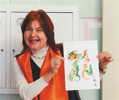 2月14日,莫斯科中國文化中心在中共六大會址常設(shè)展覽館舉辦了2018年新春聯(lián)誼會。圖為一位嘉賓展示中國民間藝人創(chuàng)作的龍形字畫。記者 張曉東攝