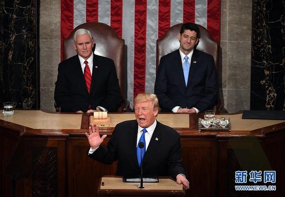 1月30日,美國總統(tǒng)特朗普(前)在華盛頓國會山發(fā)表其執(zhí)政以來的首次國情咨文演講。新華社記者 殷博古 攝