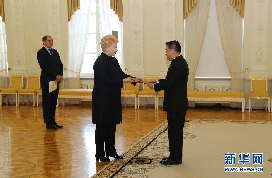 2月26日,在立陶宛首都維爾紐斯,中國(guó)駐立陶宛大使申知非向立陶宛總統(tǒng)格里包斯凱特遞交國(guó)書。新華網(wǎng)發(fā) 郭明芳攝