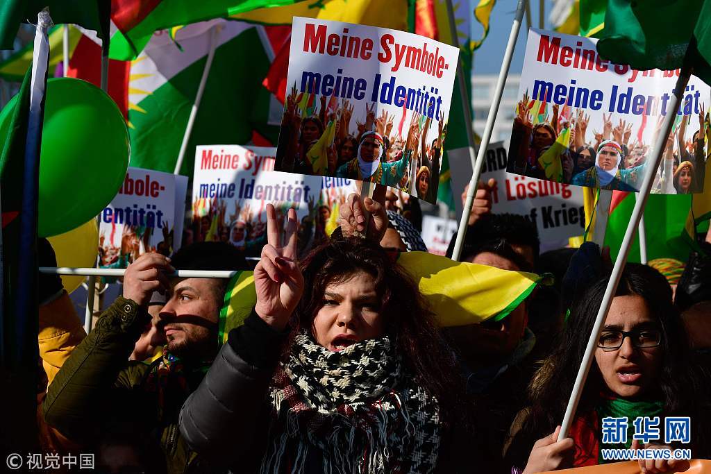 當(dāng)?shù)貢r(shí)間2018年3月3日,德國(guó)柏林,當(dāng)?shù)孛癖娕e行游行,抗議土耳其對(duì)敘利亞阿夫林地區(qū)的庫爾德人采取軍事行動(dòng)。(圖片來源:視覺中國(guó))
