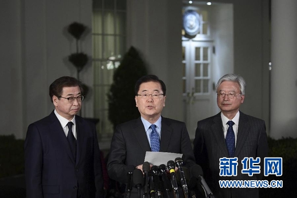 3月8日,正在美國訪問的韓國青瓦臺國家安保室室長鄭義溶(中)在華盛頓白宮說,朝鮮最高領(lǐng)導(dǎo)人金正恩委托韓方向美方轉(zhuǎn)達(dá)他希望盡快與美國總統(tǒng)特朗普會面的意愿,特朗普已經(jīng)同意在5月之前與金正恩會面。新華社/美聯(lián)