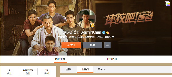 阿米爾·汗在中國(guó)社交媒體上的粉絲數(shù)過百萬,