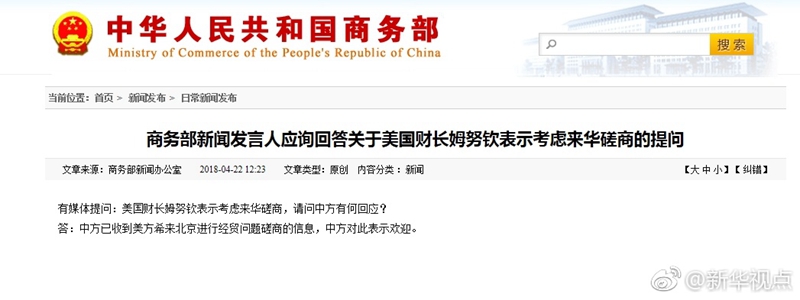 新華網(wǎng)北京4月22日電? 商務(wù)部網(wǎng)站消息,有媒體提問:美國財長姆努欽表示考慮來華磋商,請問中方有何回應(yīng)?答:中方已收到美方希來北京進(jìn)行經(jīng)貿(mào)問題磋商的信息,中方對此表示歡迎。 ????(據(jù)新華社“新華視點(diǎn)”微博報道)