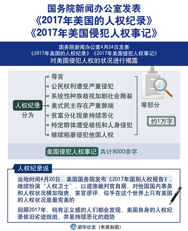 新華社北京4月24日電(記者黃小希、程卓)國務(wù)院新聞辦公室24日發(fā)表《2017年美國的人權(quán)紀(jì)錄》《2017年美國侵犯人權(quán)事記》,對(duì)美國侵犯人權(quán)的狀況進(jìn)行揭露。