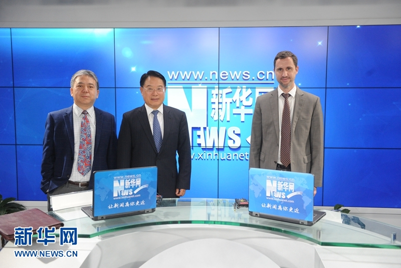 4月24日,聯(lián)合國工業(yè)發(fā)展組織總干事李勇(中)在北京接受了新華網(wǎng)獨(dú)家專訪。圖為李勇和聯(lián)合國工業(yè)發(fā)展組織副代表馬?。ㄗ螅┖吐?lián)合國工業(yè)發(fā)展組織區(qū)域首席代表(中國、朝鮮、蒙古國)包銳理(右)一行。新華網(wǎng)記者 陳競超攝