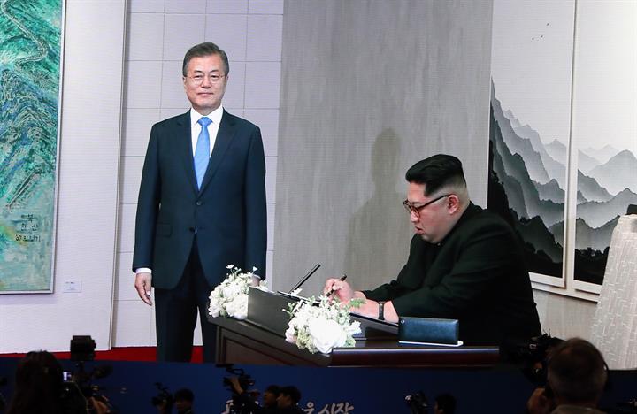 這是朝鮮最高領(lǐng)導(dǎo)人金正恩在板門店韓方一側(cè)的“和平之家”留言簿上題詞:新的歷史從現(xiàn)在開始。(拍攝自電視畫面 攝影:李鵬)?