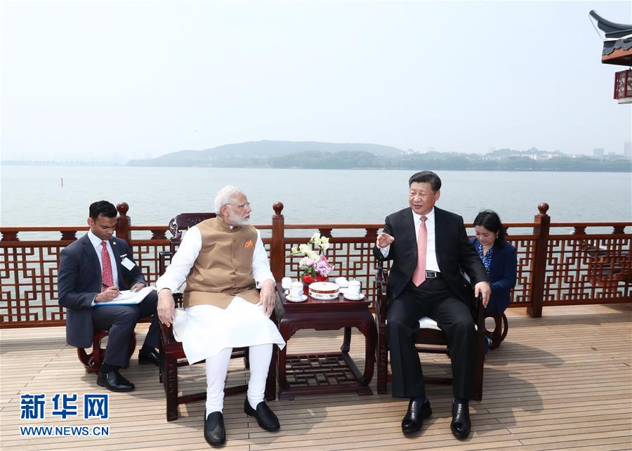 4月27日和28日,國家主席習(xí)近平在武漢東湖賓館同印度總理莫迪舉行非正式會晤。這是4月28日,習(xí)近平同莫迪交談。 新華社記者 鞠鵬 攝