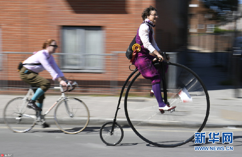當?shù)貢r間2018年5月5日,英國倫敦,當?shù)嘏e辦復古騎行活動,民眾身穿花呢子服裝騎車穿行在倫敦街頭。今年是該活動舉辦十周年。(圖片來源:東方IC)