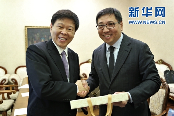 5月14日,在阿斯塔納,中國國家稅務總局局長王軍(左邊)在會議開始前與哈薩克斯坦副總理多薩耶夫舉行會晤。新華網(wǎng)發(fā) 阿比洛夫攝