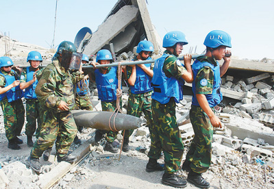 截至目前,中國赴黎巴嫩工兵分隊發(fā)現(xiàn)、排除地雷和未爆物9719枚,并完成大量營房、設(shè)備的維修任務(wù)。