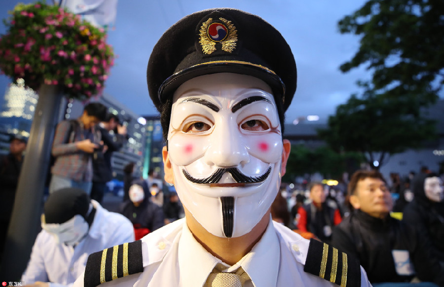 當(dāng)?shù)貢r(shí)間2018年5月18日,韓國首爾,大韓航空有限公司的飛行員戴著蓋伊·??怂姑婢?,在首爾市區(qū)集會(huì)抗議,反對大韓航空會(huì)長兼首席執(zhí)行官趙亮鎬及其家庭。