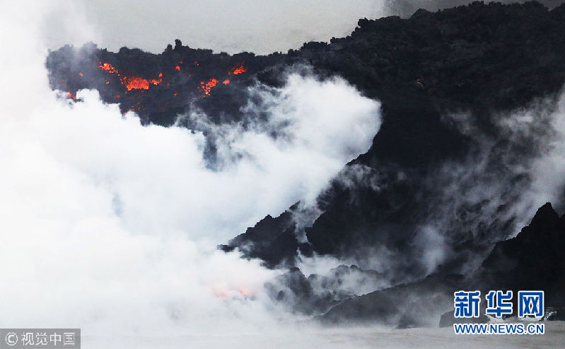 當(dāng)?shù)貢r(shí)間2018年5月22日,美國夏威夷,基拉韋厄火山大規(guī)模噴發(fā)持續(xù),火山噴發(fā)的熔巖流入太平洋,形成了有毒的“蒸汽云”。(圖片來源:視覺中國)