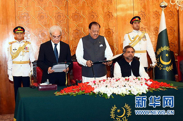 6月1日,在巴基斯坦伊斯蘭堡,納賽爾·穆爾克(前左)宣誓就任巴過渡政府總理。新華社發(fā)